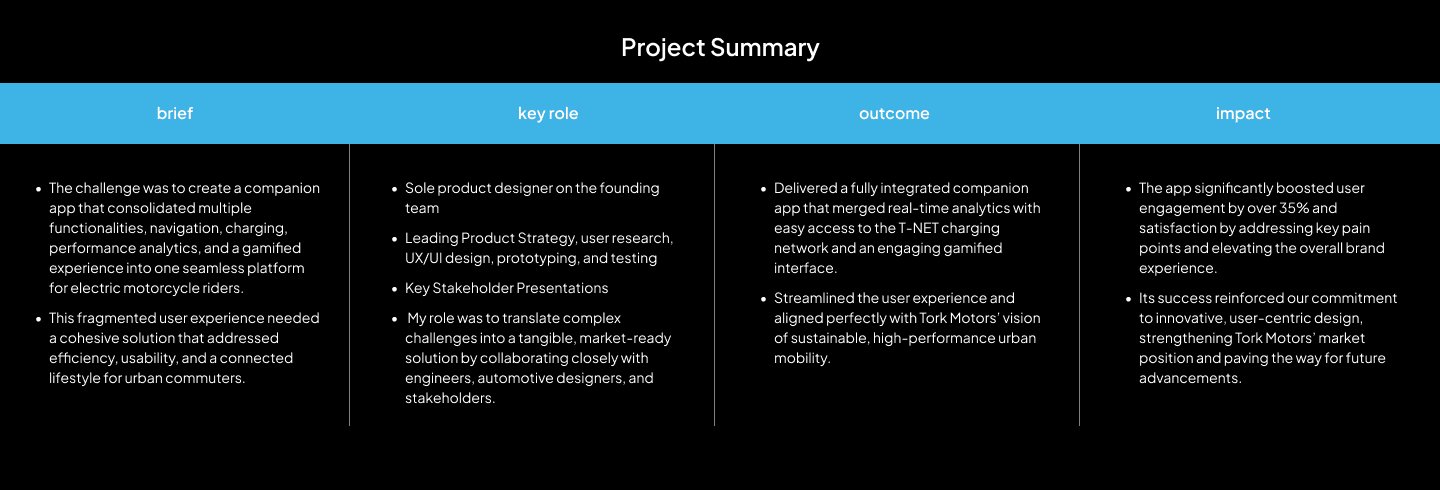 I joined Tork Motors as a product designer when it was a small team of 30 people mostly engineers, automotive designers and developers. I led the product, UX and UI strategy for the team. I've been extremely fortunate to have part of this journey and have grown tremendously during my time at Tork, some key achievements of which I have listed below: